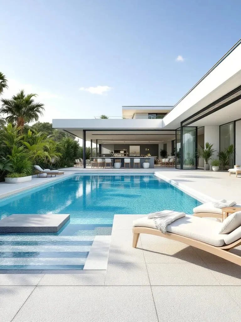 Якщо басейн з’являється після тераси або ландшафту — він порушує вже створену логіку. Якщо ж усе планується разом, простір «працює» без зайвих рішень.
