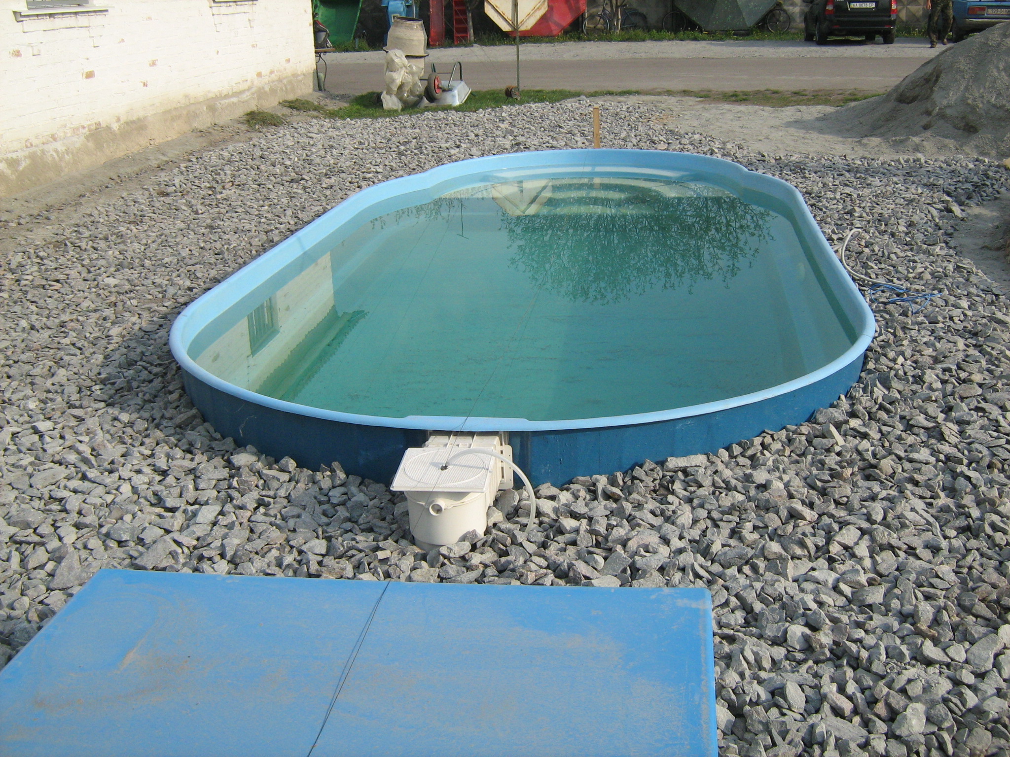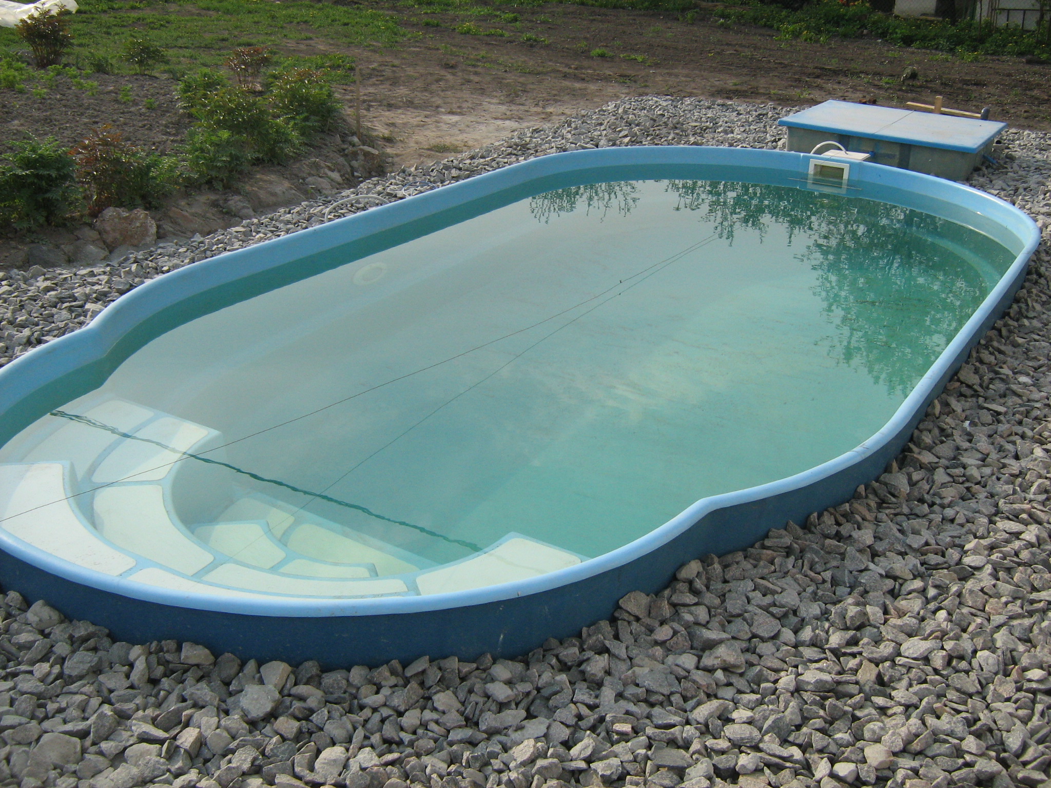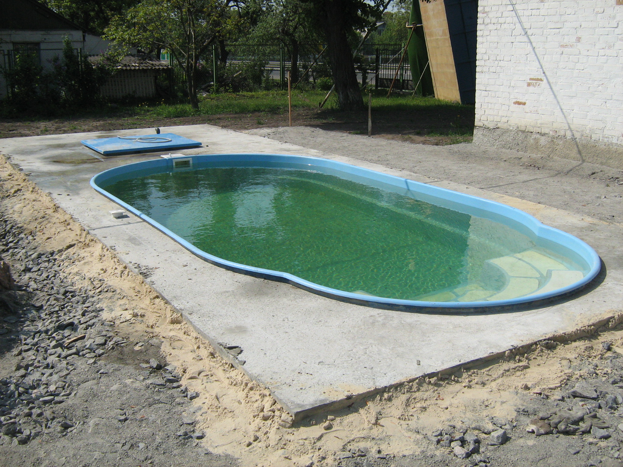 - Роботи земельного підготовчого характеру. Після вибору місця та самого басейну виконуються земельні роботи. Це включає видалення рослин, вирівнювання поверхні та підготовку фундаменту для басейну.