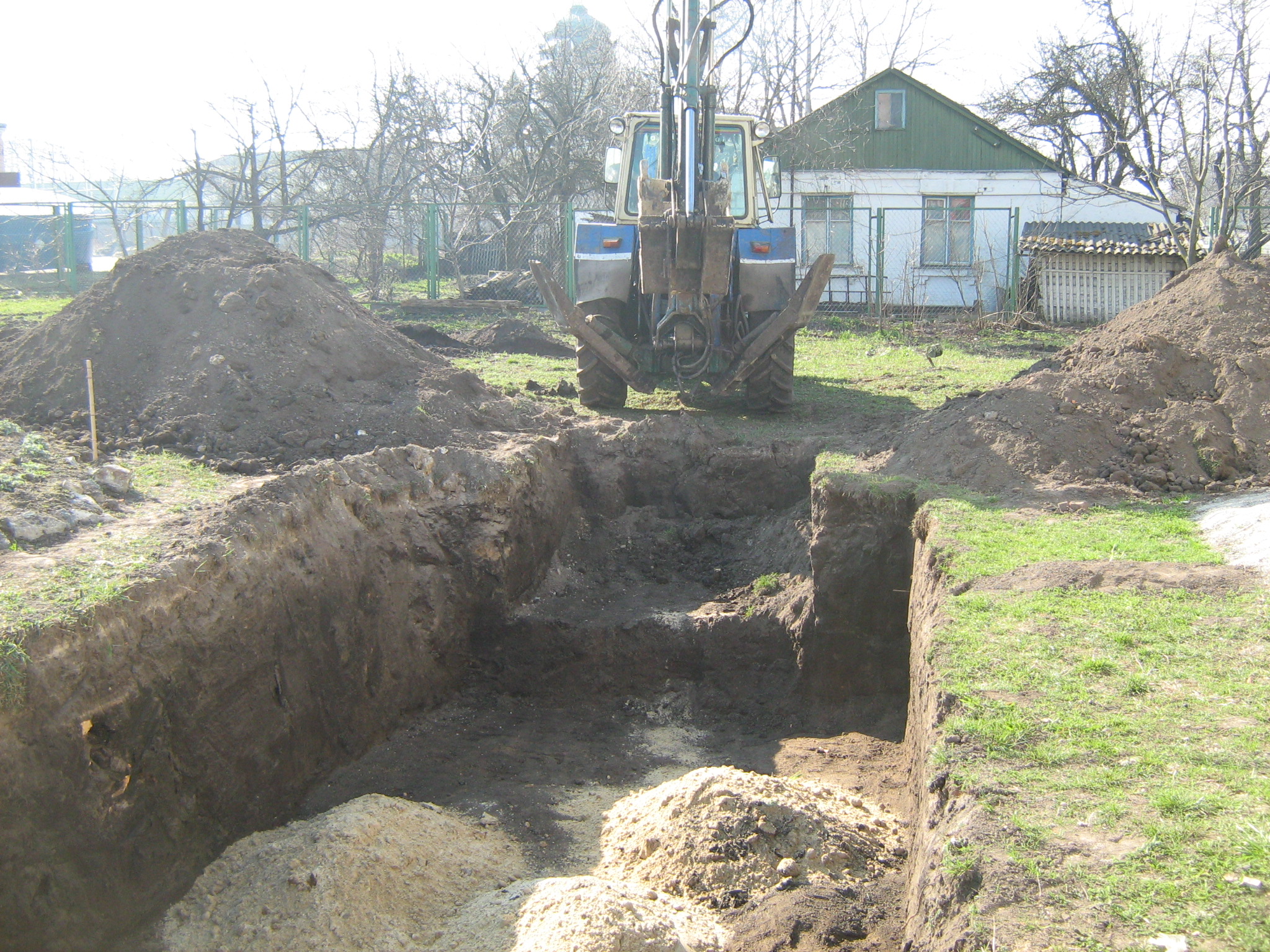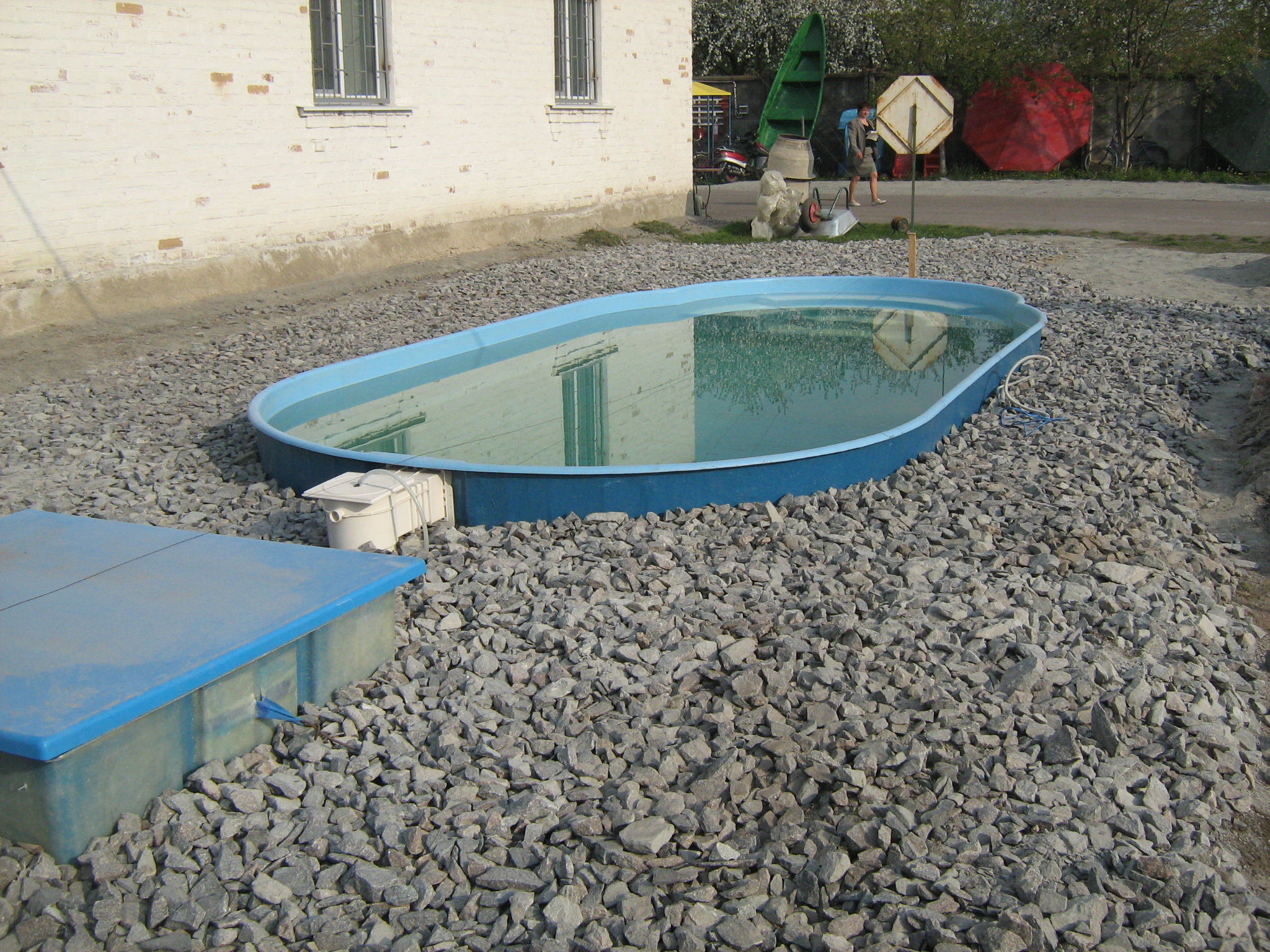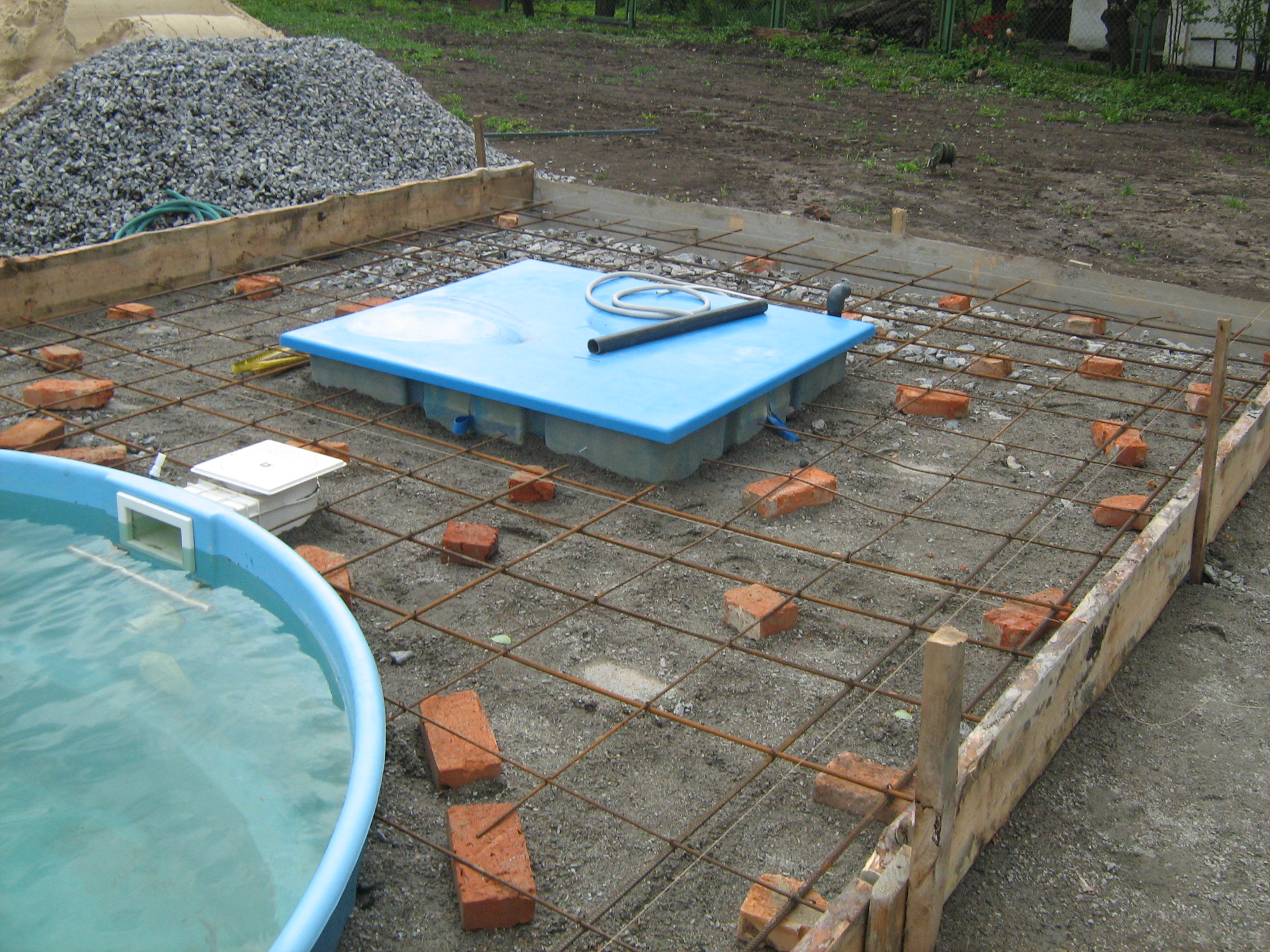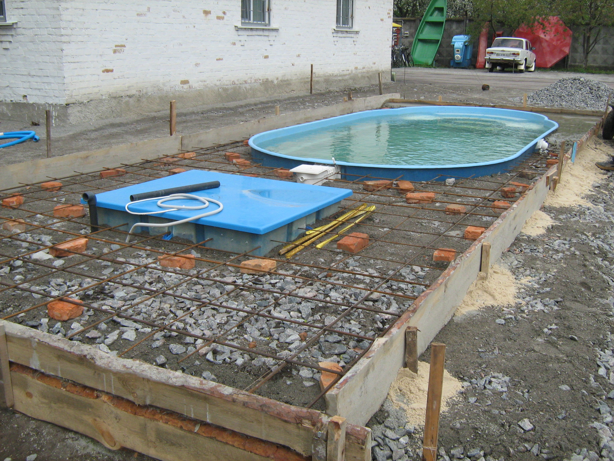 - Роботи земельного підготовчого характеру. Після вибору місця та самого басейну виконуються земельні роботи. Це включає видалення рослин, вирівнювання поверхні та підготовку фундаменту для басейну.