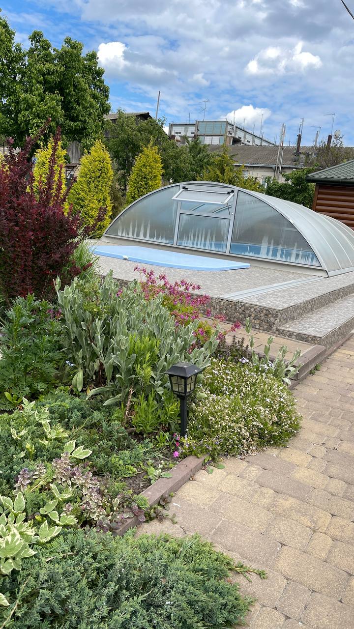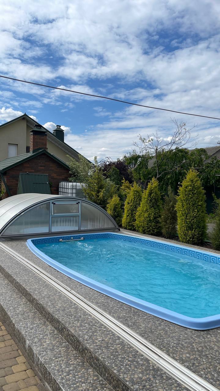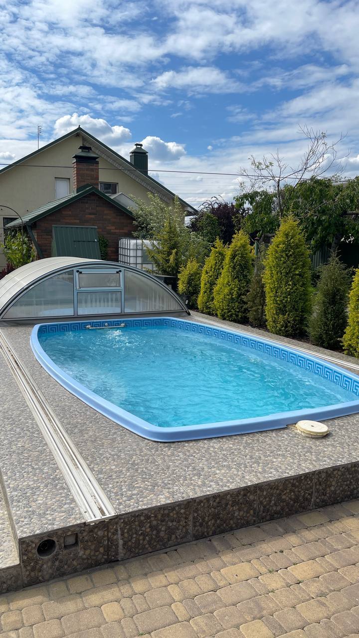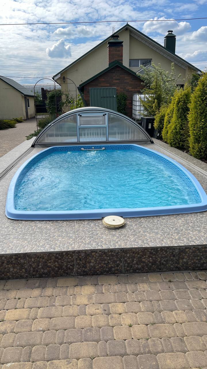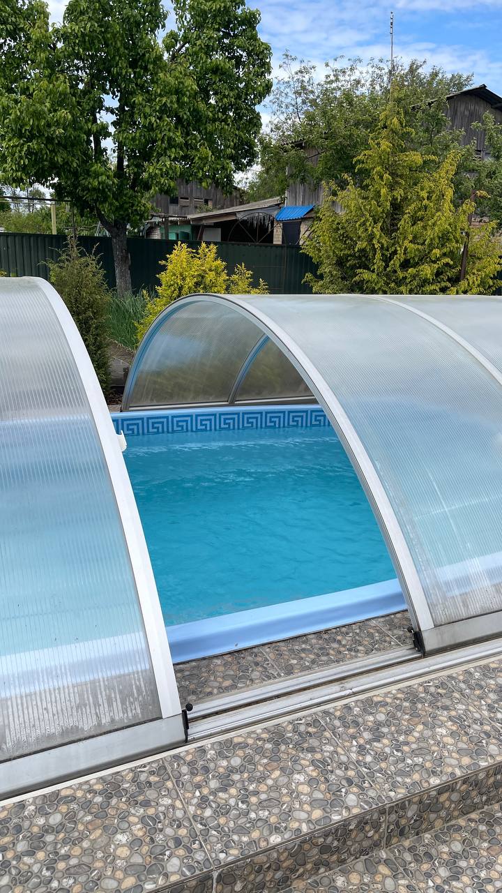 Окрім чаші, ми одразу встановили телескопічний павільйон із полікарбонату. Він закриває басейн повністю, зсуваючись по рейках, змонтованих у терасі.